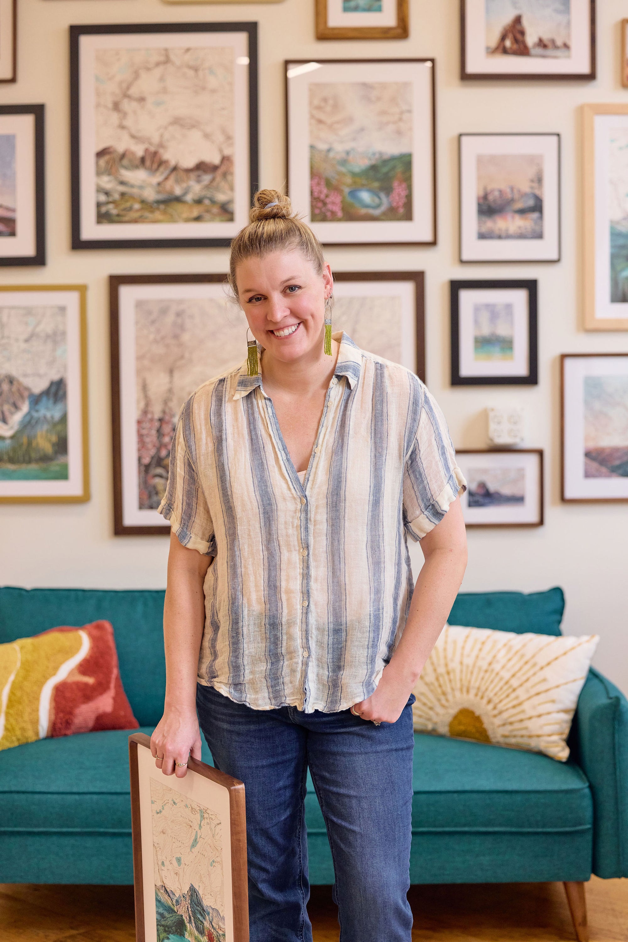 Katie’s creative process begins with vintage topographic maps, each chosen for its unique lines and contours that mirror the natural world. She then alters the map’s colors to set the mood of the landscape, layering acrylic paint to build depth and form. Finishing touches in fine ink add precision and detail, capturing the essence of each place with artistry and care. Each piece reflects the balance between rugged terrain and refined craftsmanship, making every artwork a lasting tribute to the wilderness that inspired it.
