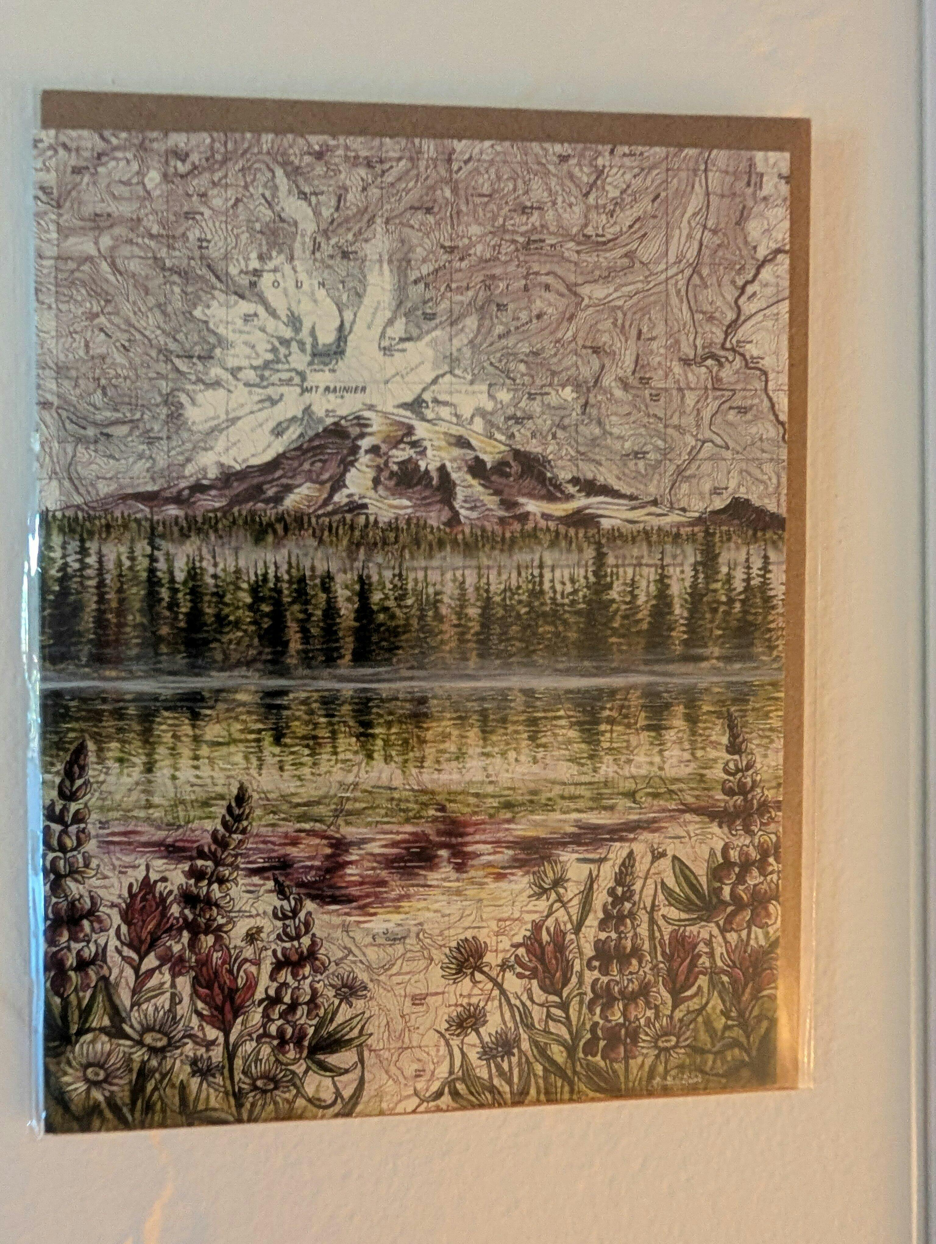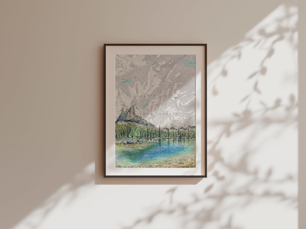 This print features Katie Jeanne Reim's Alice Lake, Sawtooth Mountains artwork, beautifully painted on a vintage topographic map. The design is oriented in portrait, capturing the tranquil charm of Idaho's high alpine gem, surrounded by jagged peaks and pristine wilderness.