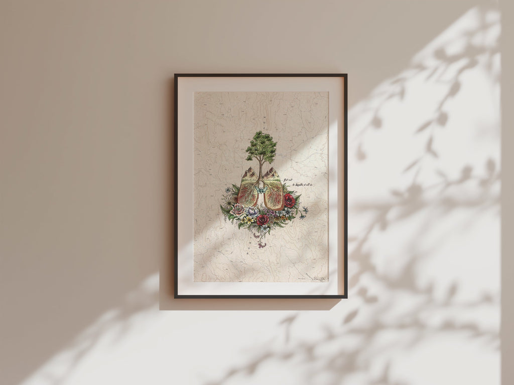This print features Katie Jeanne Reim's Breath It All In artwork, painted over a vintage topographic map. Presented in portrait orientation, this stunning piece intertwines anatomical lung details with delicate natural elements, evoking the vital connection between breathing and the outdoors.