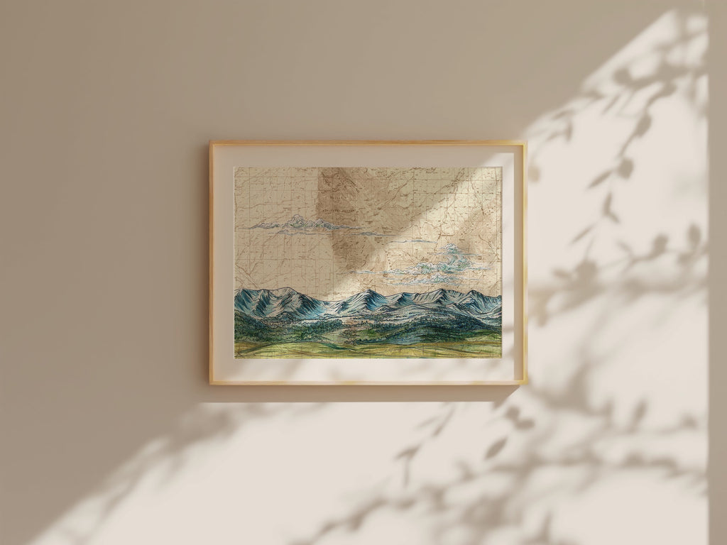 This print features Katie Jeanne Reim's Bridger Range artwork, beautifully painted on a vintage topographic map. The design is oriented in landscape, capturing the dramatic ridgelines and rugged beauty of Montana's iconic mountain range.