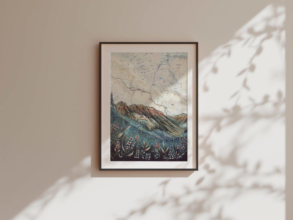 This print features Katie Jeanne Reim's Cascade Pass, North Cascades National Park artwork, beautifully painted on a vintage topographic map. The piece is presented in portrait orientation, capturing the rugged beauty of Cascade Pass, a stunning alpine destination known for its sweeping views of jagged peaks, glaciers, and lush valleys.
