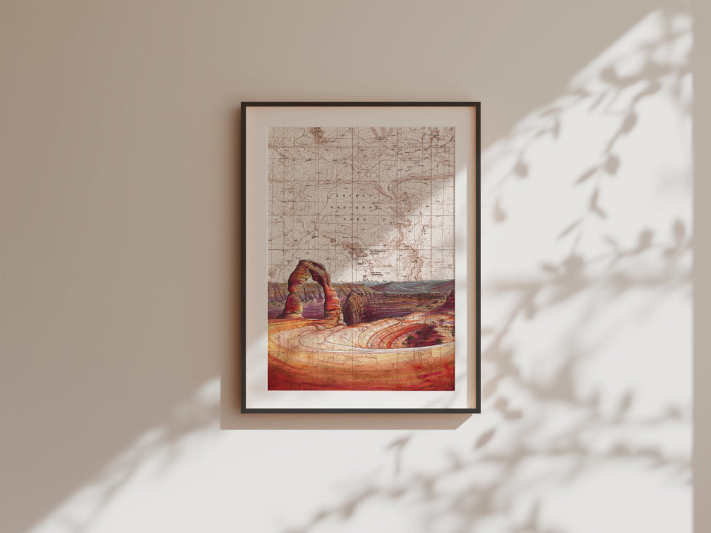 This print features Katie Jeanne Reim's Delicate Arch, Arches National Park artwork, beautifully painted on a vintage topographic map. The piece is presented in portrait orientation, highlighting the grandeur of this iconic natural sandstone arch framed against Utah's rugged desert terrain.