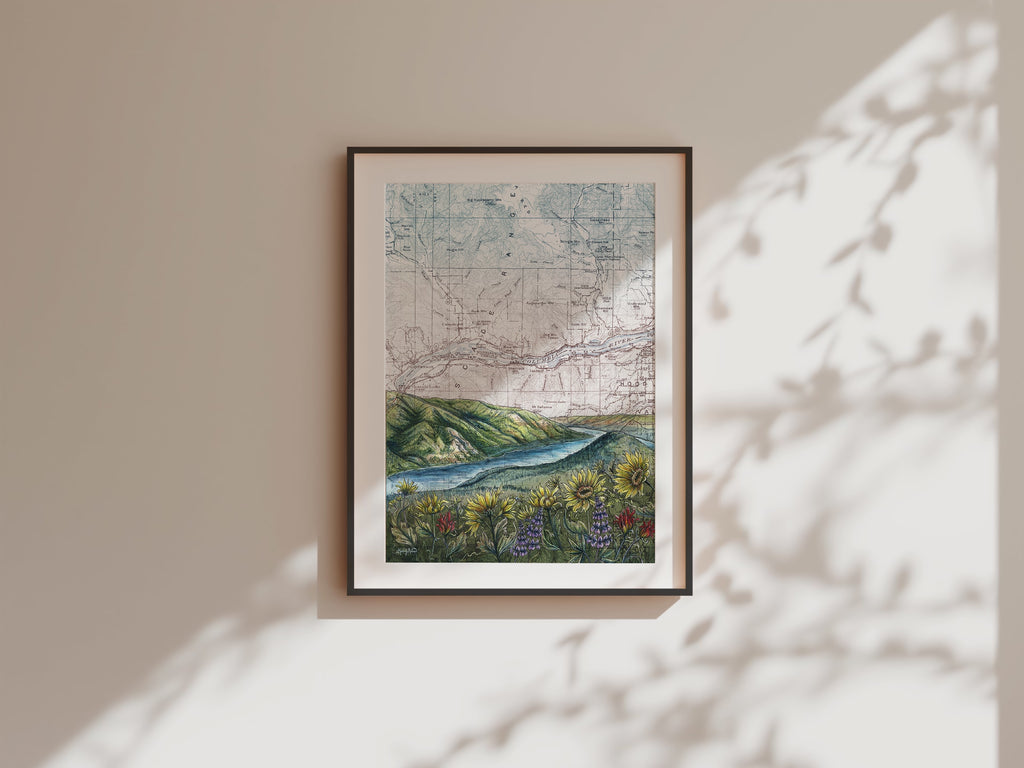This print features Katie Jeanne Reim's Dog Mountain Bloom, Columbia River Gorge artwork, beautifully painted on a vintage topographic map. The portrait-oriented piece captures the vibrant beauty of Dog Mountain, located in the Columbia River Gorge, known for its stunning wildflower blooms during the spring and summer months.