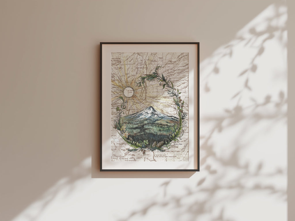 This print features Katie Jeanne Reim's East Wy'east, Mount Hood artwork, beautifully painted on a vintage topographic map. The piece is presented in portrait orientation, highlighting the serene and striking eastern face of Oregon's iconic Mt. Hood.