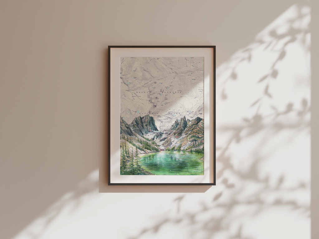 This print features Katie Jeanne Reim's Emerald Lake, Rocky Mountain National Park artwork, beautifully painted on a vintage topographic map. The design is oriented in portrait, highlighting the serene beauty of Colorado’s iconic alpine lake, framed by dramatic peaks and lush wilderness.