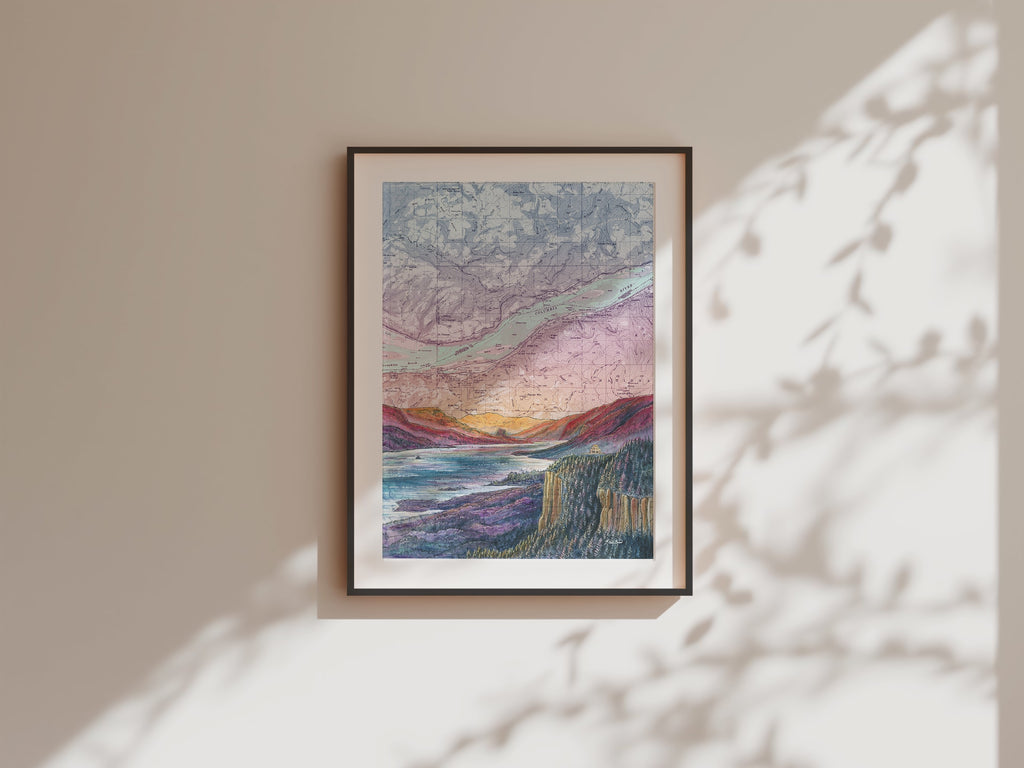This print features Katie Jeanne Reim's Crown Point, Columbia River Gorge artwork, beautifully painted on a vintage topographic map. The piece is presented in portrait orientation, capturing the vivid sunrise hues over the Columbia River Gorge Vista House, framed by its iconic cliffs and lush landscapes. This print embodies the breathtaking beauty of one of the most scenic areas in Oregon and Washington.