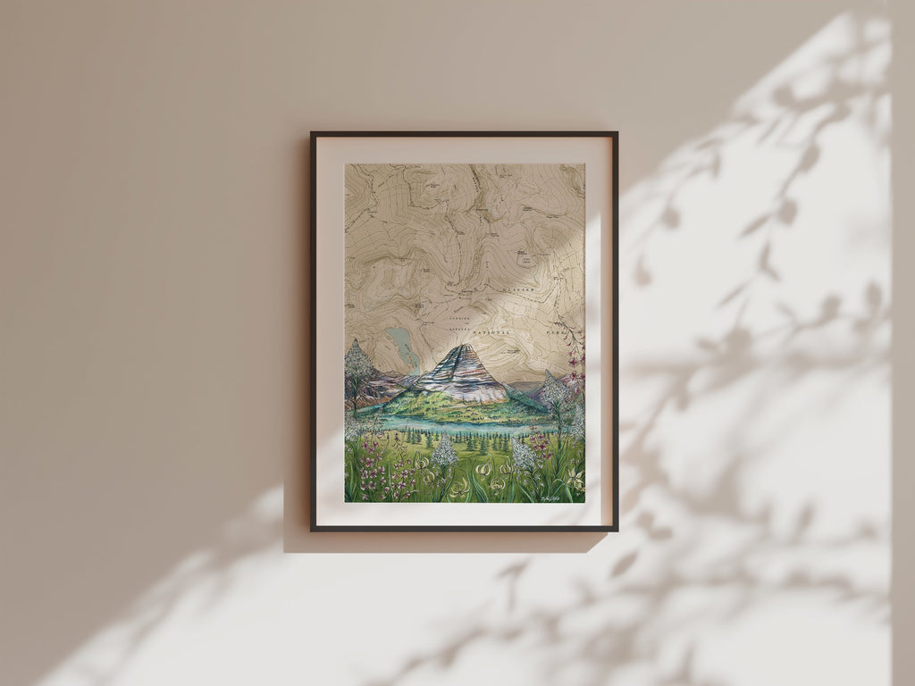 This print features Katie Jeanne Reim's Hidden Lake, Glacier National Park artwork, beautifully painted on a vintage topographic map. The design is oriented in portrait, capturing the tranquil beauty of Montana's alpine lake, surrounded by rugged peaks and pristine wilderness.