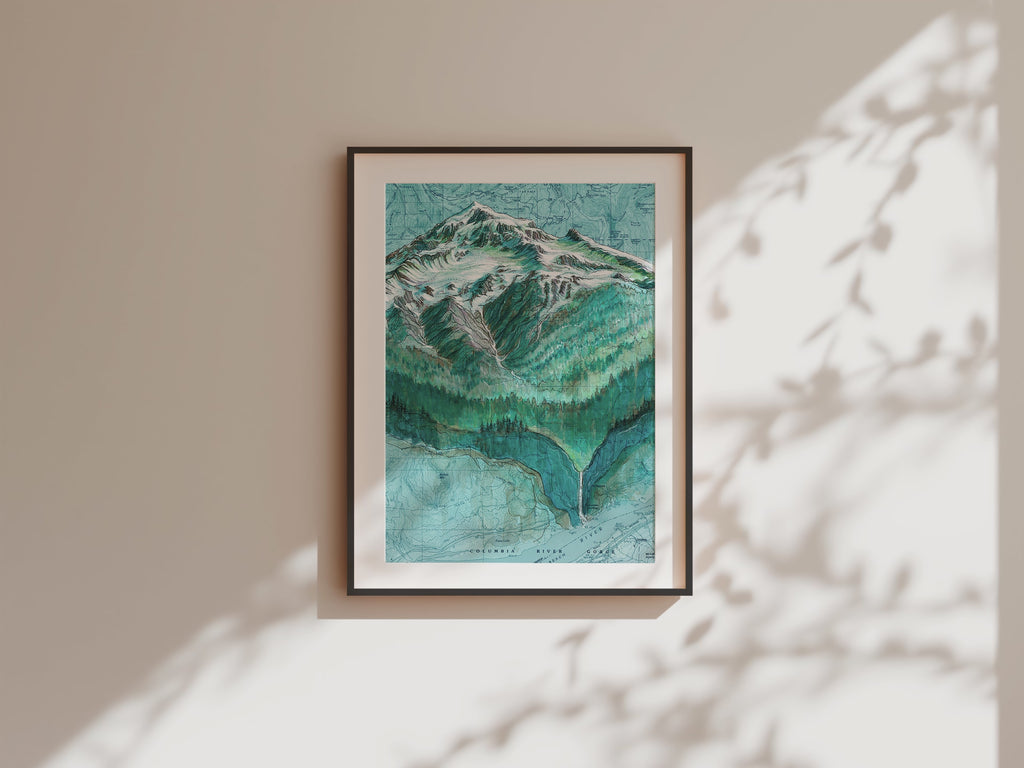This print features Katie Jeanne Reim's Hood Falls, Mt. Hood artwork, beautifully painted on a vintage topographic map. The piece is presented in portrait orientation, showcasing the dramatic waterfall cascading down the slopes of Oregon’s iconic Mount Hood. The print captures the vibrant beauty of this serene yet powerful scene, bringing a piece of the Pacific Northwest into your home.