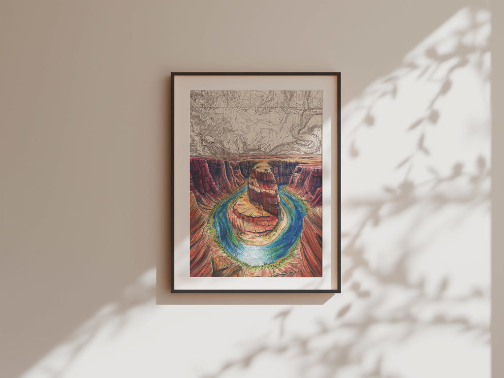 This print features Katie Jeanne Reim's Horseshoe Bend artwork, beautifully painted on a vintage topographic map. The piece is presented in a portrait orientation, capturing the sweeping curves and vibrant essence of Arizona's iconic landmark.