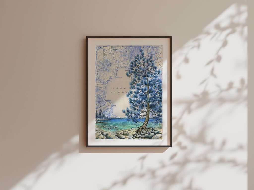 This print features Katie Jeanne Reim's Lake Tahoe Jeffrey Pine artwork, beautifully painted on a vintage topographic map. The piece is presented in a portrait orientation, highlighting the striking elegance of the iconic Jeffrey Pine against the backdrop of Lake Tahoe's natural beauty.
