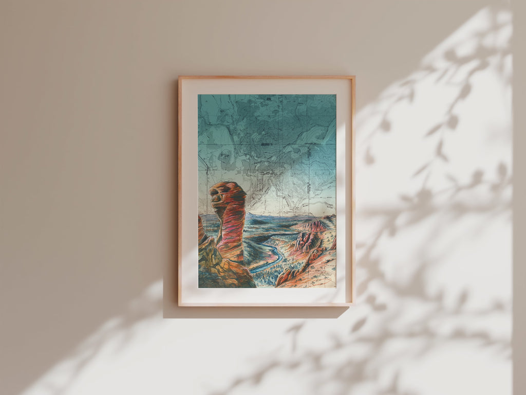 This print features Katie Jeanne Reim's Monkey Face in Smith Rock artwork, beautifully painted on a vintage topographic map. The piece is presented in a portrait orientation, showcasing the dramatic cliffs and rugged beauty of Oregon’s iconic rock climbing destination.