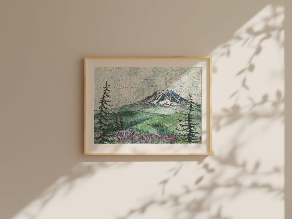 This print features Katie Jeanne Reim's Mount Adams Summer artwork, beautifully painted on a vintage topographic map. The piece is presented in landscape orientation, celebrating the vibrant summer hues and majestic presence of Washington's towering stratovolcano.