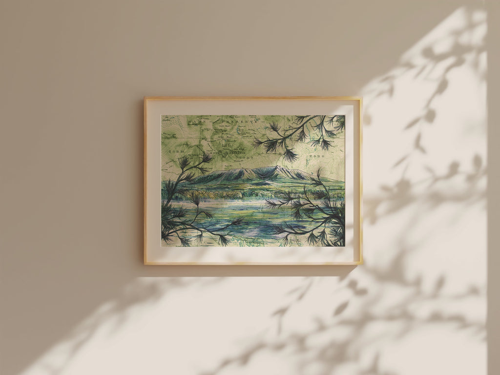 This print features Katie Jeanne Reim's Mount Katahdin artwork, beautifully painted on a vintage topographic map. The design is oriented in landscape, celebrating the majestic prominence of Maine's highest peak, nestled within the rugged wilderness of Baxter State Park.