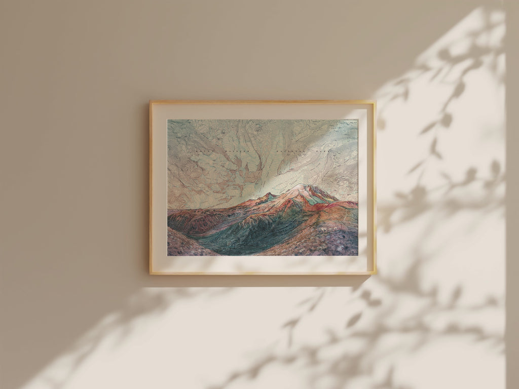 This print features Katie Jeanne Reim's Mount Rainier Borroughs Mountain Trail artwork, beautifully painted on a vintage topographic map. Presented in landscape orientation, the piece captures the sweeping view of Mount Rainier towering above a family of mountain goats, showcasing the rugged terrain and stunning contrasts of the mountain’s snow-capped peaks with the surrounding wild landscape.