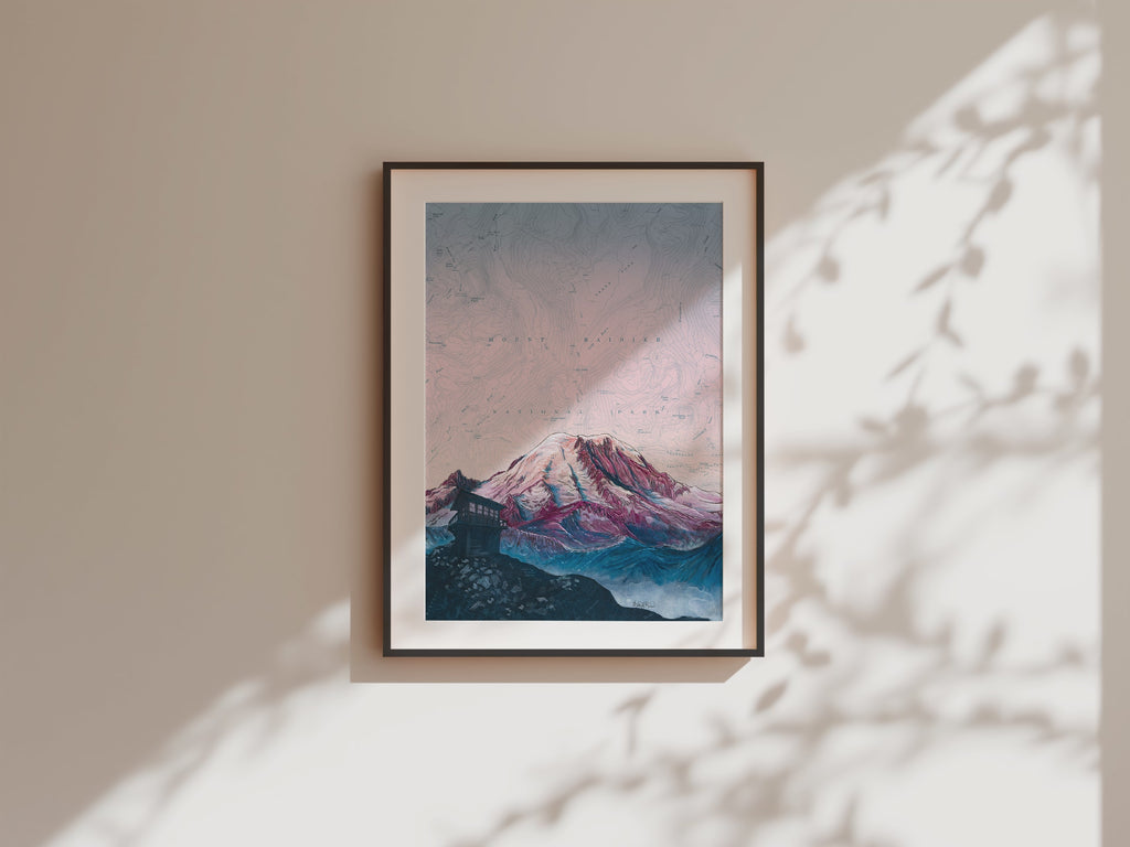 This print features Katie Jeanne Reim's Mount Rainier Fremont Lookout artwork, beautifully painted on a vintage topographic map. Presented in portrait orientation, this vivid image captures the dramatic view on Mt Rainier.