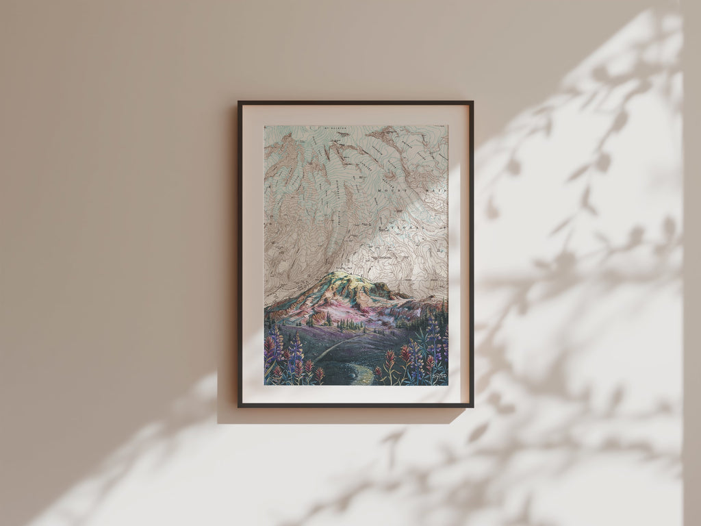 This print features Katie Jeanne Reim's Mount Rainier Skyline Trail artwork, beautifully painted on a vintage topographic map. Presented in portrait orientation, the piece captures the wild beauty of summer wildflowers along the Skyline Trail in Mount Rainier National Park.