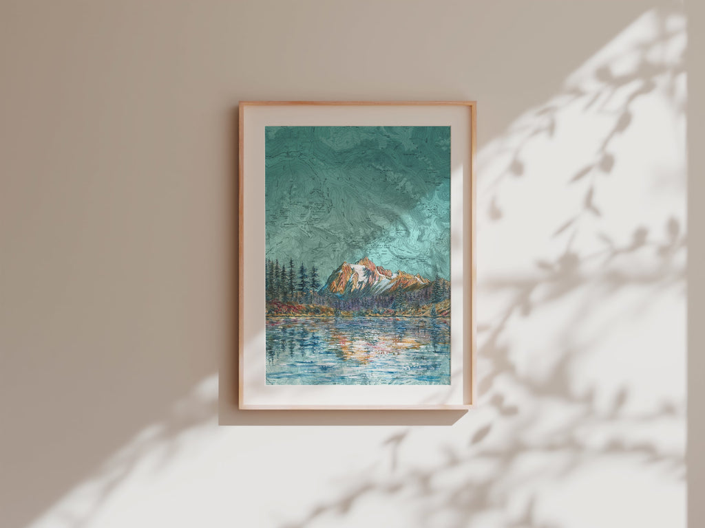 This print features Katie Jeanne Reim's Mount Shuksan over Picture Lake artwork, beautifully painted on a vintage topographic map. Presented in portrait orientation, the rich alpine colors, crisp ridgelines, and shimmering water bring this iconic Washington view to life.