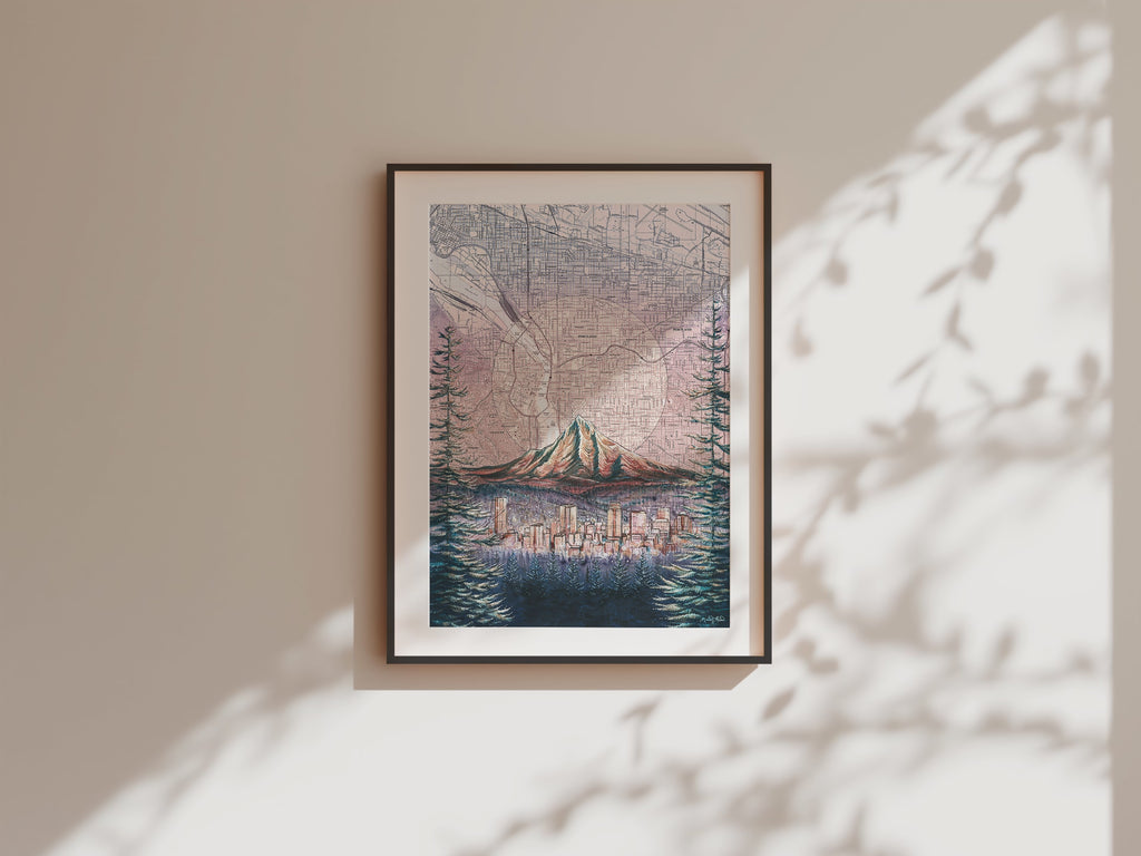 This print features Katie Jeanne Reim's Portland Glow artwork, beautifully painted on a vintage topographic map. The design is oriented in portrait, a tribute to the city’s twilight magic, capturing that fleeting moment when Portland hums with color and calm under the glow of Mt Hood and the city lights.