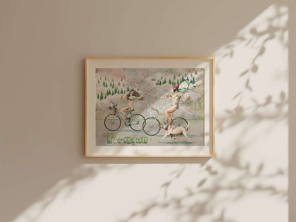 This print features Katie Jeanne Reim's Portland Naked Bike Ride artwork, expertly painted over a vintage topographic map. The design is oriented in landscape, capturing the playful and rebellious spirit of Portland’s iconic annual event.