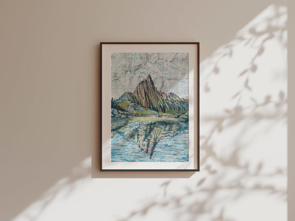 This print features Katie Jeanne Reim's Prusik Peak, The Enchantments artwork, beautifully painted on a vintage topographic map. The portrait-oriented piece highlights the iconic jagged peaks of Prusik Peak, one of the most renowned summits in Washington's Enchantments, set against the rugged beauty of the surrounding alpine landscape.