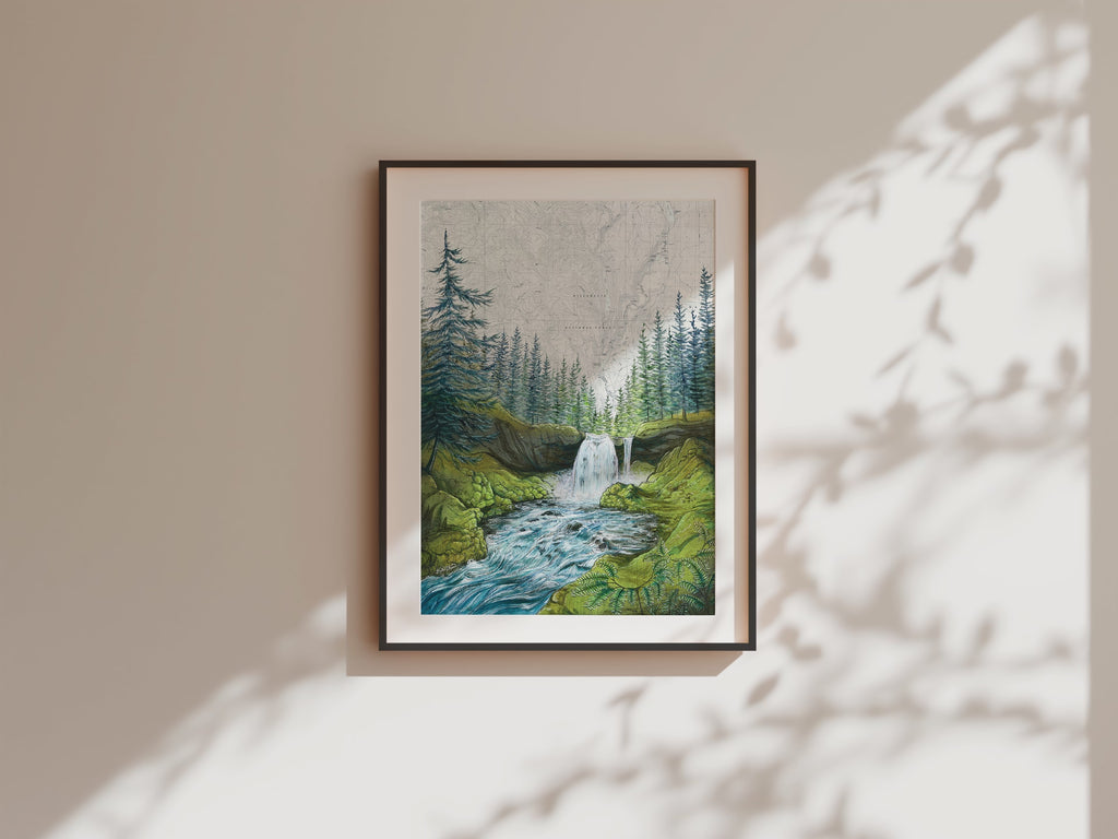 This print features Katie Jeanne Reim's Sahalie Falls, McKenzie River artwork, beautifully painted on a vintage topographic map. The design is presented in portrait orientation, capturing the cascading beauty and vibrant greenery of Oregon’s iconic waterfall.