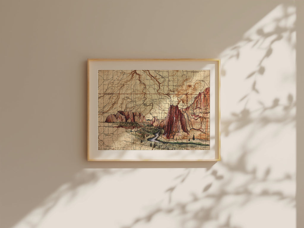 This print features Katie Jeanne Reim's Smith Rock artwork, beautifully painted on a vintage topographic map. The piece is presented in a portrait orientation, showcasing the dramatic cliffs and rugged beauty of Oregon’s iconic rock climbing destination.