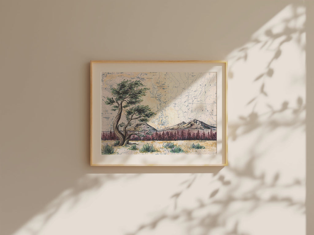 This print features Katie Jeanne Reim's Three Sisters Dusk artwork, beautifully painted on a vintage topographic map. The piece is presented in a landscape orientation, capturing the serene beauty of Oregon’s iconic peaks as they transition into the evening light.