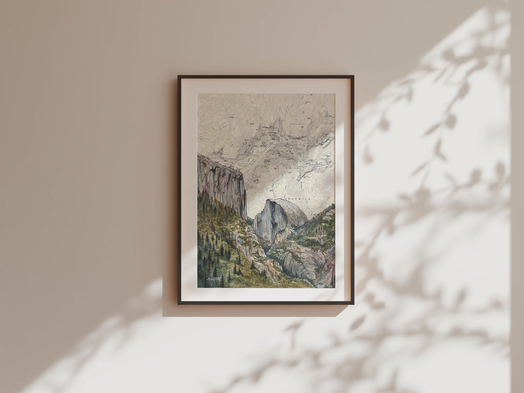 This print features Katie Jeanne Reim's Tunnel View, Yosemite National Park artwork, beautifully painted on a vintage topographic map. The piece is presented in a portrait orientation, showcasing the awe-inspiring vista of Yosemite Valley, including El Capitan, Half Dome, and Bridalveil Fall, captured with Katie's signature style.