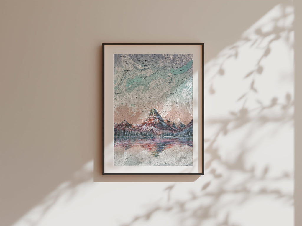 This print features Katie Jeanne Reim's Two Medicine Lake, Glacier National Park artwork, beautifully painted on a vintage topographic map. The piece is presented in a portrait orientation, showcasing the serene reflection of towering peaks in the crystal-clear waters of this remote Montana gem.