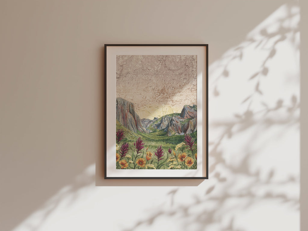 This print features Katie Jeanne Reim's Yosemite Wildflowers artwork, a celebration of the vibrant flora found within Yosemite National Park. Painted on a vintage topographic map, this piece is designed in portrait orientation, bringing the delicate beauty of Yosemite's wild blooms to life.
